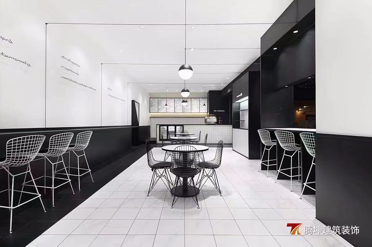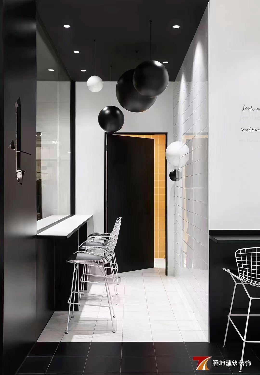 在如今这个年代,时尚不仅仅指服装,音乐等等,就连餐厅,也开始与时尚接轨,一家家流行着时尚元素的时尚餐厅出现在城市中。餐厅狭长的外立面被黑色轮廓线清晰划分,大招牌以光栅立体画的形式呈现“门”的开合动态变化。黑白色块间的利落分界完成了对空间的分区;白色空间中穿插着黑色的点线元素作为点缀:球形吊灯、整齐排布的吊线,纯白墙面上黑色细铁丝被弯成了有趣的时尚格言文本。同时,黑色折面的运用强化结构感,白色的网格状吧台椅及餐桌则同样为黑色背景织入线与面的元素。拐角区域的装置成为严谨空间中的个性隐喻:大大小小的球体漂浮着从门缝中涌出,令四周的规整空间发生扭曲形变,同时又逐渐融入墙面的黑白色方格。