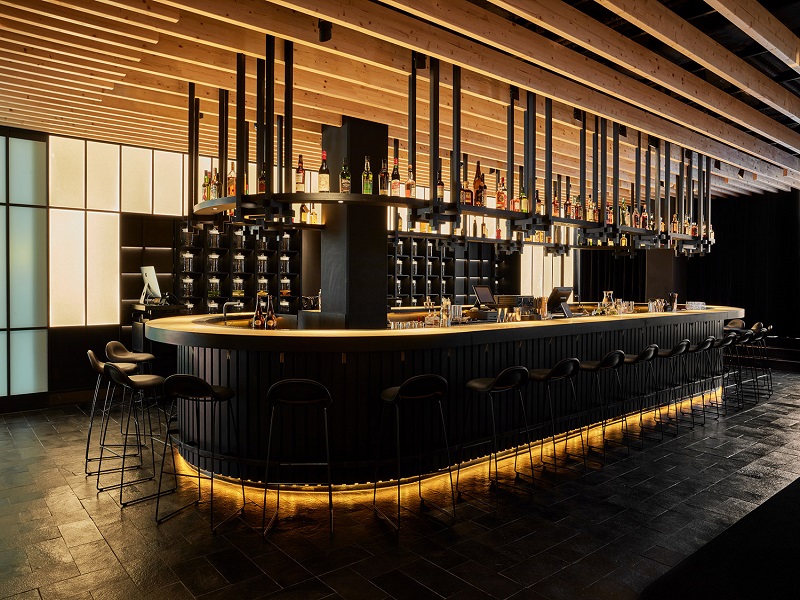 居酒屋两侧的米纸板镶嵌在黑色木质框架中,纸板背面的灯光照亮了这个空间。隐藏在其中的门将人引入衣帽间、洗手间和威士忌吧。沿吧台的长边,米纸板向内凹进形成一处陈列架,摆放着一列列日式广口瓶。
