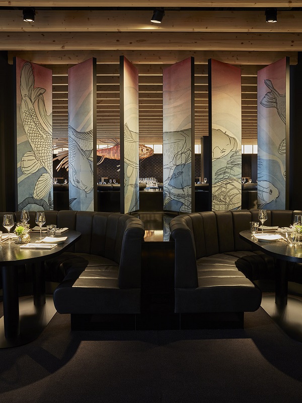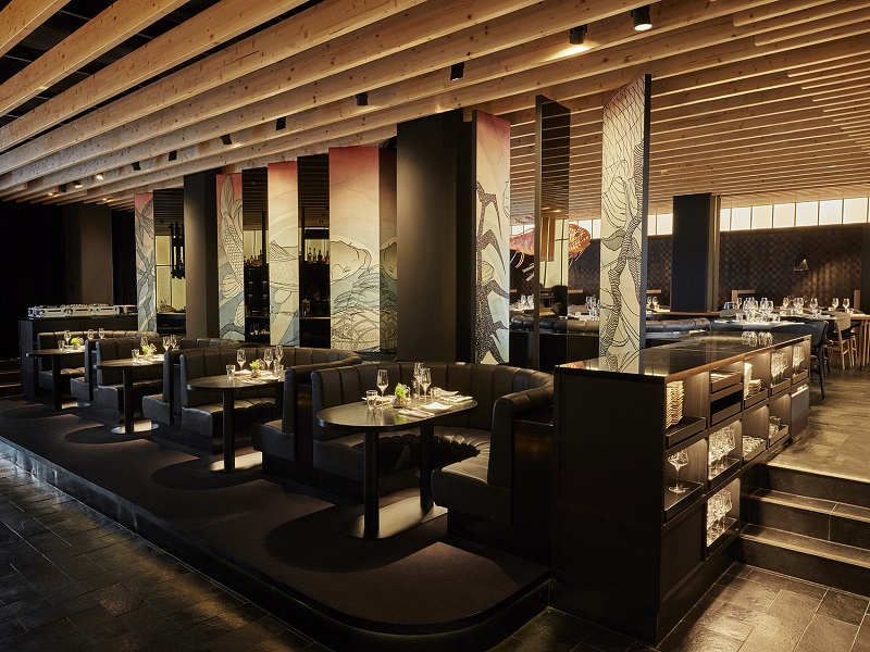 餐厅由一系列的黑色材料以及与此形成对比的浅色木板构成。该木板面向厨房装饰在天花板以及墙壁上。这个空间被位于餐厅中心的卡座区划分为两块,三级阶梯的高度差让入口处的吧台区域与后方更为安静的用餐区分开。在阶梯的两侧是集合服务设备、餐具、瓷器、收银机器和DJ设备的橱柜。