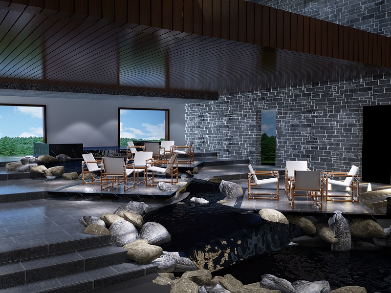在风格上材质的选择体现了当代特征,木材、石材与流水,明暗、刚柔对比组合。