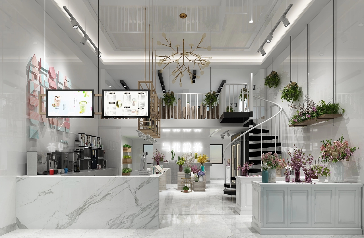 本次装修风是现代化的简约风格,根据业主想要的花店与茶的结合去用简约风最大化突出想表现的特点,· 奶茶+花坊作为花店结合餐饮形式的一家多元化餐厅,希望能在喧嚣的城市中打造一处隐于市的“世外桃源”。快节奏的生活方式使得身处其中的人们愈发迫切的寻求一片可以慢下来享受生活的净土,以安抚自身燥动的灵魂。