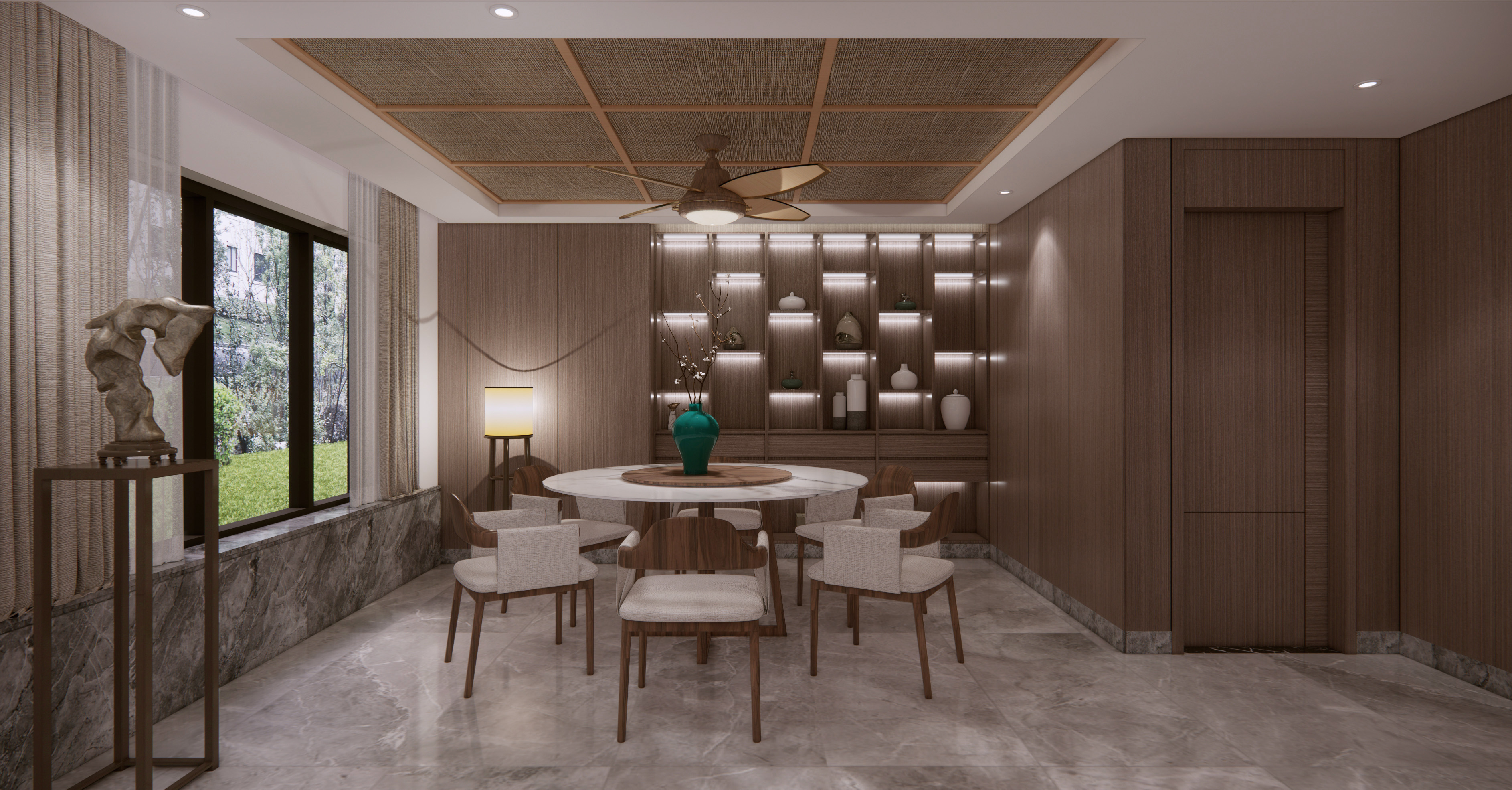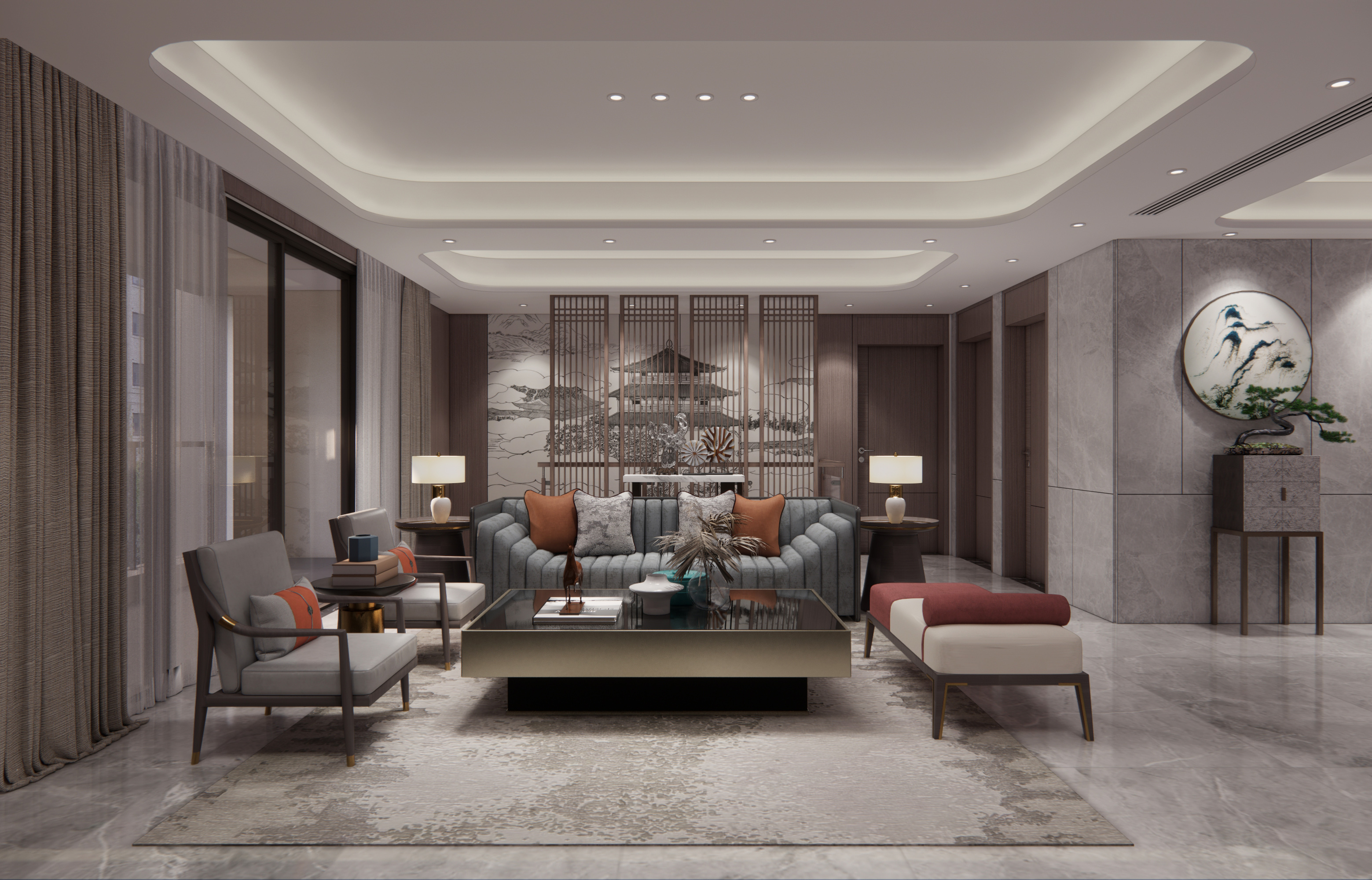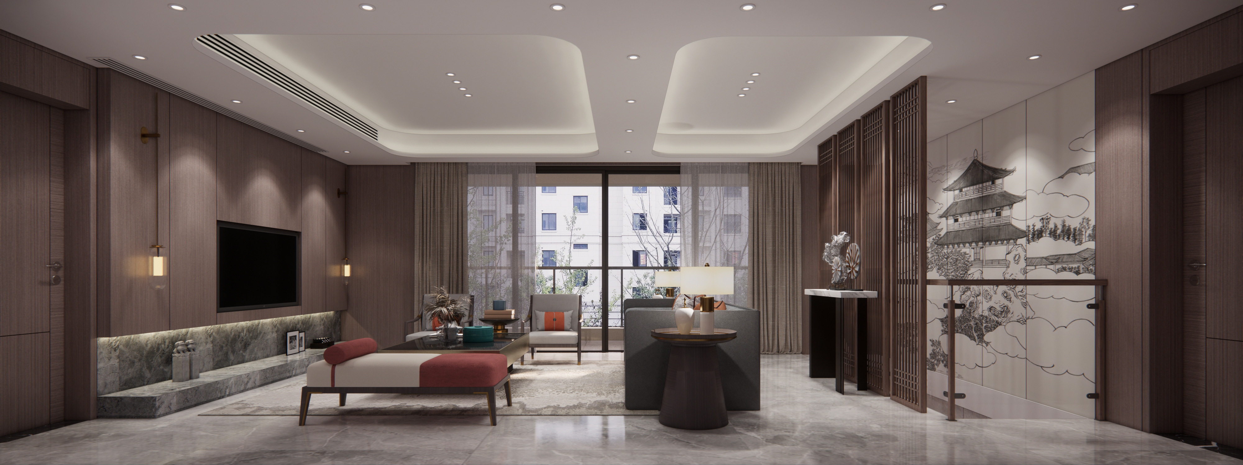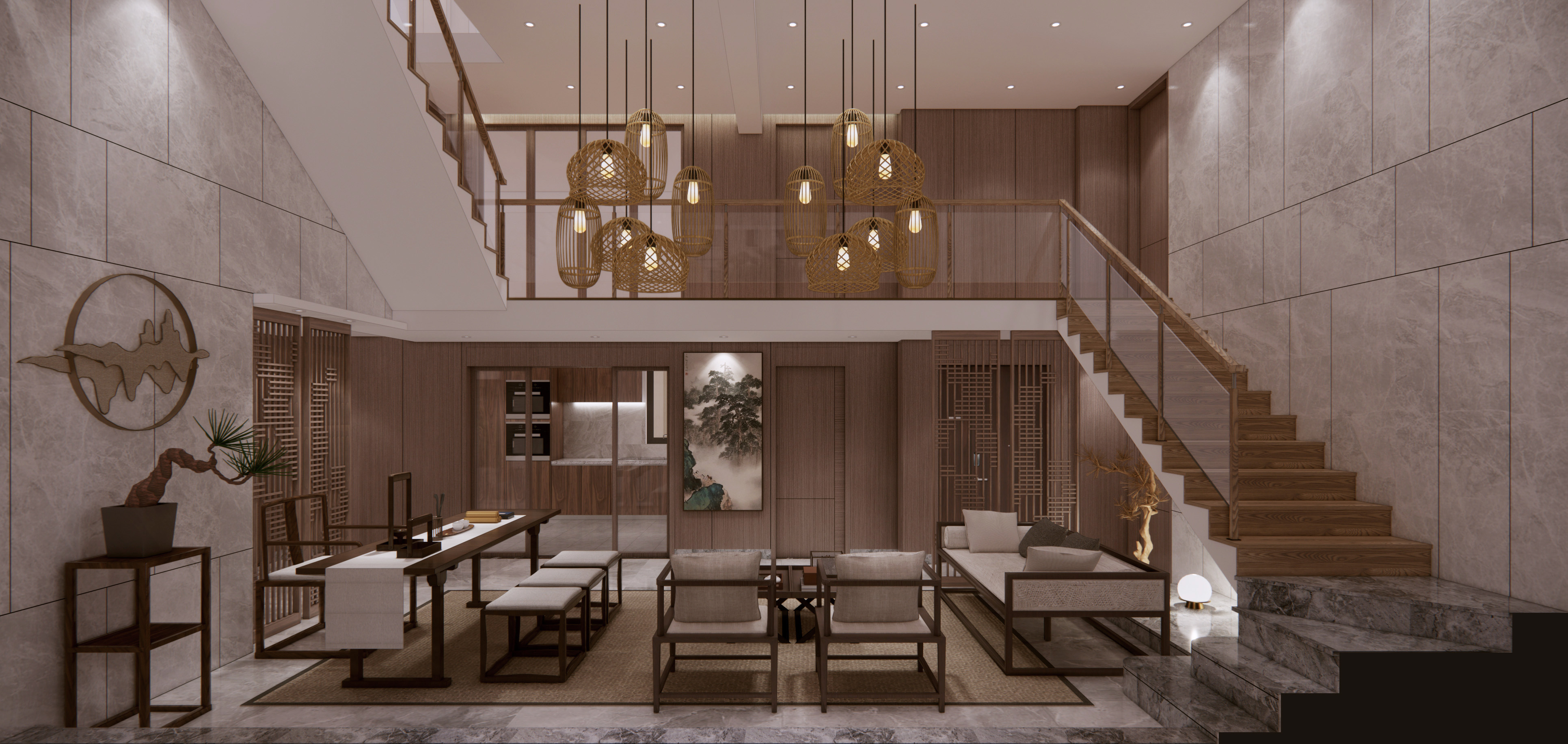 业主的房子位于南昌湾里区,装修风格新中式偏现代, 从现浇到拎包入住,业主都十分满意。整个装修清新奢华。4米6落地大窗户,采光非常好。马可波罗大理石纹理75*150大板砖上墙,奢华高档,挑空层实木贴皮木饰面上墙,木皮纹理清新可见,一楼客厅大板砖上墙,十分漂亮,业主对选材十分满意,色彩搭配相得益彰。配上大红鹰黑檀实木家具,高档奢华的感觉一进大厅就映入眼帘,高端大气上档次。