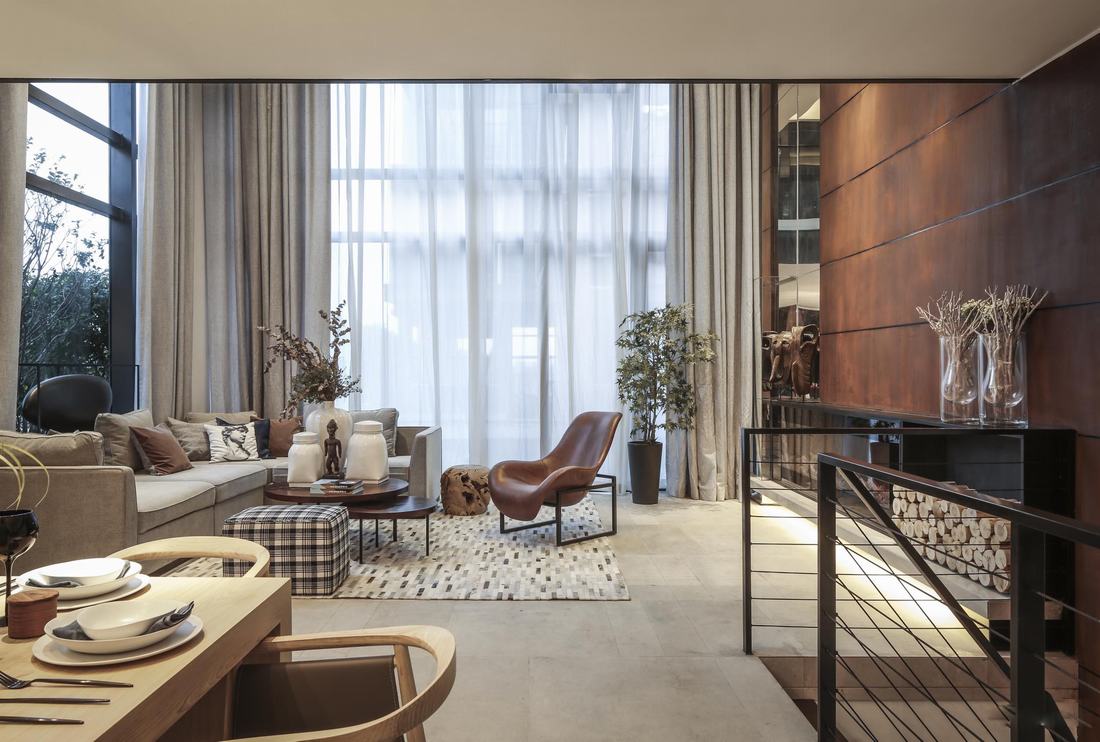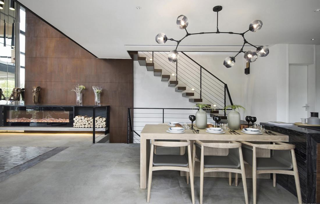 每一寸阳光的移动都为室内的明暗光影带来不同的变化,一层通过5.5米的中空落地窗与建筑窗框、窗纱的碰撞,光影形成多重投射,墙身锈铁板,既体现材料自然的质感,也是各楼层空间的连接点,通过楼梯由地下一层延伸到地上三层,木色钢制楼梯,结合上方的天窗,白天与黑夜在不同光线下具有神奇的透视效果。开放式的厨房、一张加长的原木餐桌,即使全天在室内游走,同样的一个沙发位置,同样的一扇窗前,所看到的景象与感受也迥然不同。这不仅仅是移步换景,更是“移时换景”,是人与空间、自然所能发生的最和谐丰富的关系形态。