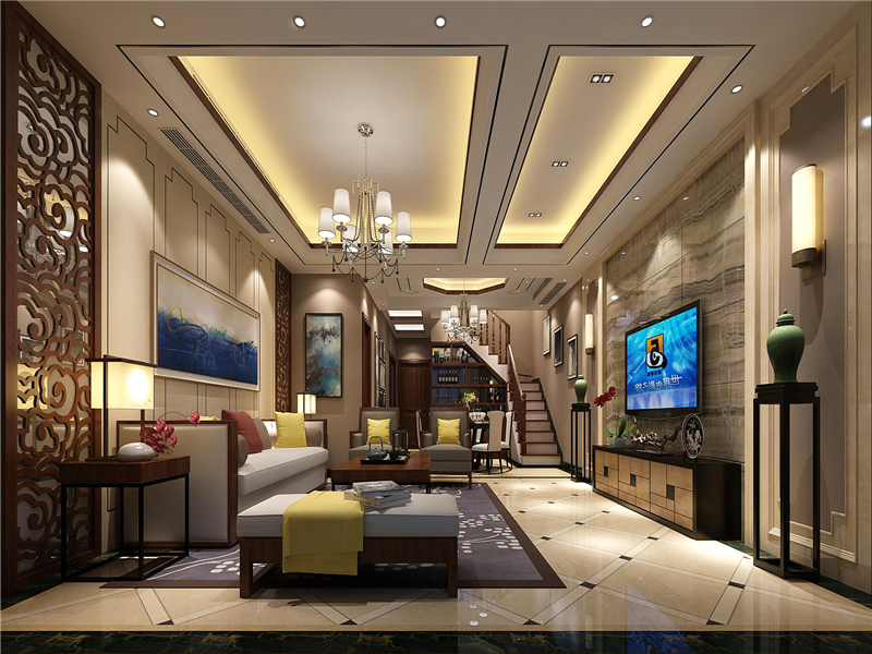 大厅的中式元素非常丰富,不管是家居还是沙发背后的屏风,处处都体现出新中式的设计风格。