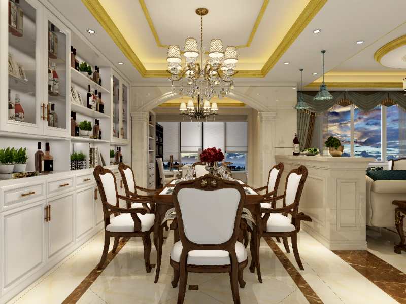 餐厅与客厅之间摆放天然大理石吧台,使餐厅光线不受阻碍,主人及其朋友可在闲暇之余享受酒水带来的舒适,家人也可以聊天,尝尝自己做的美食。书房与餐厅之间的通道是敞开的,主人动线十分便利,采光通风都是极佳,欧式罗马柱与线条的搭配,尽享奢华富贵。