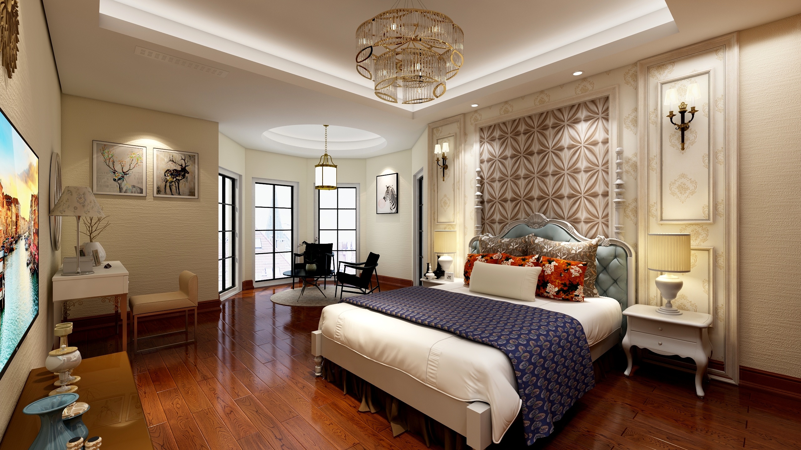 主卧是主人休息的区域,我们更希望这是休闲惬意的,所以采用淡色色系硅藻泥,床头背景墙采用软包布艺和石塑线条,搭配暖色灯光,即使在寒冷的冬天,也能给主人带来不一样的温暖。八角阳台运用弧形吊顶,分出一个独特的空间,清晨,倒一杯牛奶,配一份糕点,享受清新的世界,傍晚,劳碌一天的主人更希望一份安逸,坐在这里畅游网络海洋,阅读不一样的人生。