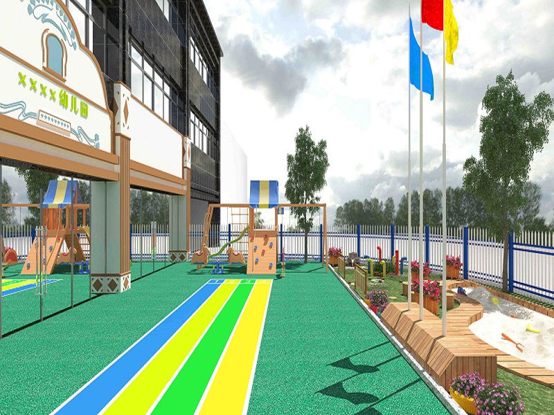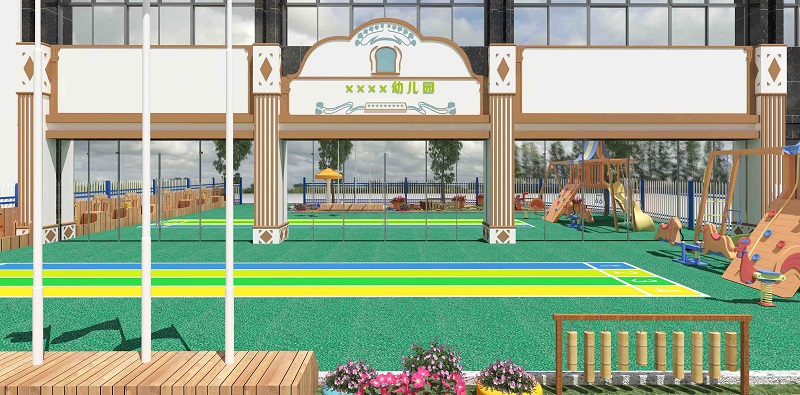这是一个童话幼儿园的装修效果图,我们可以称它为现实中的童话,它给予了孩子们梦幻般的感觉,它的室外设计就很有特点,昭示着这是一个童话的世界,不管是外观还是室外小田径场,简直可以就是萌萌哒。