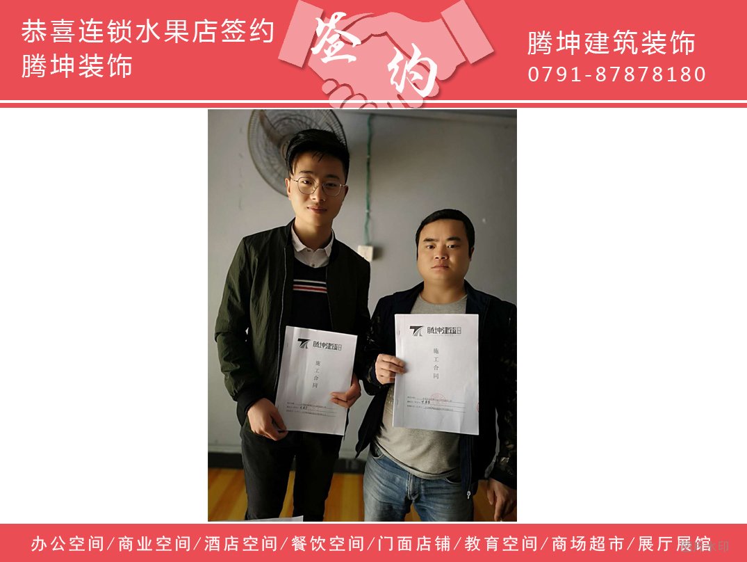 恭喜艾先生万达广场连锁水果店签约腾坤装饰,非常感谢艾先生对腾坤装饰的认可以及支持,创意缔造非凡,实力铸就品质,在后期的装修过程中,腾坤装饰一定竭诚为您服务。