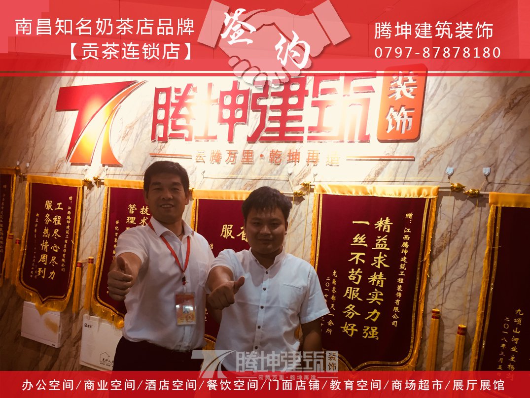 关键词: 办公室写字楼装修 、 商场店铺装修 、 酒店宾馆装修 、 餐饮茶楼装修 、 家居别墅装修 、 会所网咖装修 、 南昌奶茶店连锁品牌-贡茶签约腾坤装饰、