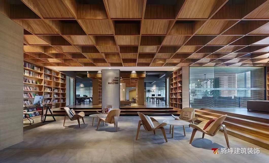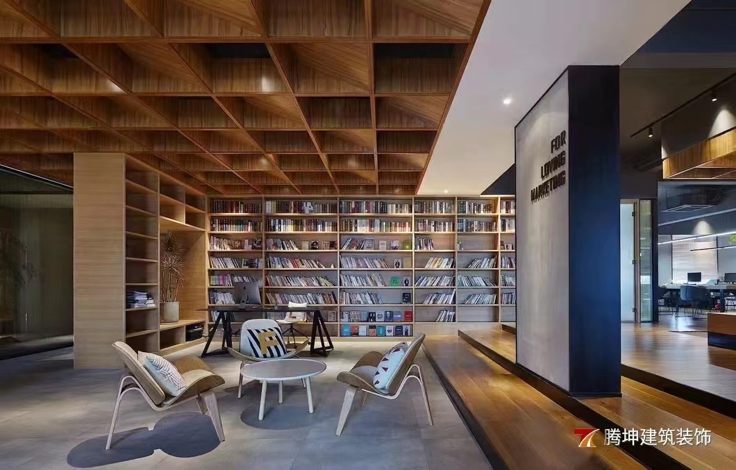 本次装修风格是深色原木风格,办公空间作为人们每日的工作场所,环境所带来的感觉意境非常的重要。温润的原木色调,干练的线条块面,不张扬,却自成一道风景。空间敞亮,洽谈区随意而有序摆放的家具,舒适且放松。会议室简洁原木屋顶,嵌入简约灯管,融合轻巧的桌椅设计,增添了静谧与书香气,帮助员工摆脱紧张的会议情绪,进行更行之有效的会议沟通和效率提升。各个区间隔墙也都由书架完成,开放式的布局不但保证了空间的采光与通透性,更能营造自由随性,放松自在的活动氛围。灯光融进书架、木纹,书本,仿佛思想可以游离,闪着智慧的光芒。