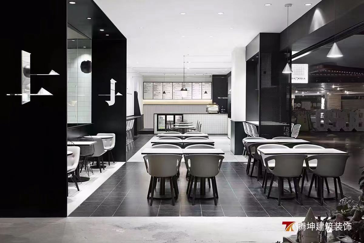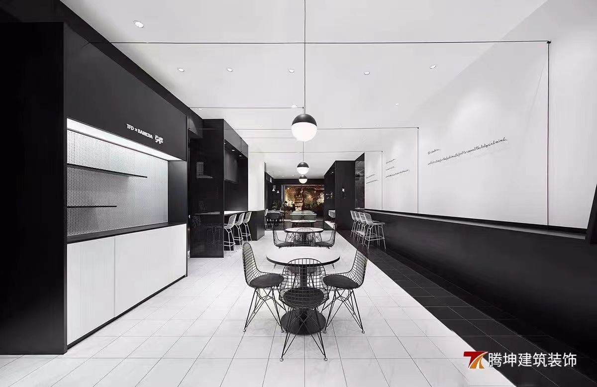 在如今这个年代,时尚不仅仅指服装,音乐等等,就连餐厅,也开始与时尚接轨,一家家流行着时尚元素的时尚餐厅出现在城市中。餐厅狭长的外立面被黑色轮廓线清晰划分,大招牌以光栅立体画的形式呈现“门”的开合动态变化。黑白色块间的利落分界完成了对空间的分区;白色空间中穿插着黑色的点线元素作为点缀:球形吊灯、整齐排布的吊线,纯白墙面上黑色细铁丝被弯成了有趣的时尚格言文本。同时,黑色折面的运用强化结构感,白色的网格状吧台椅及餐桌则同样为黑色背景织入线与面的元素。拐角区域的装置成为严谨空间中的个性隐喻:大大小小的球体漂浮着从门缝中涌出,令四周的规整空间发生扭曲形变,同时又逐渐融入墙面的黑白色方格。