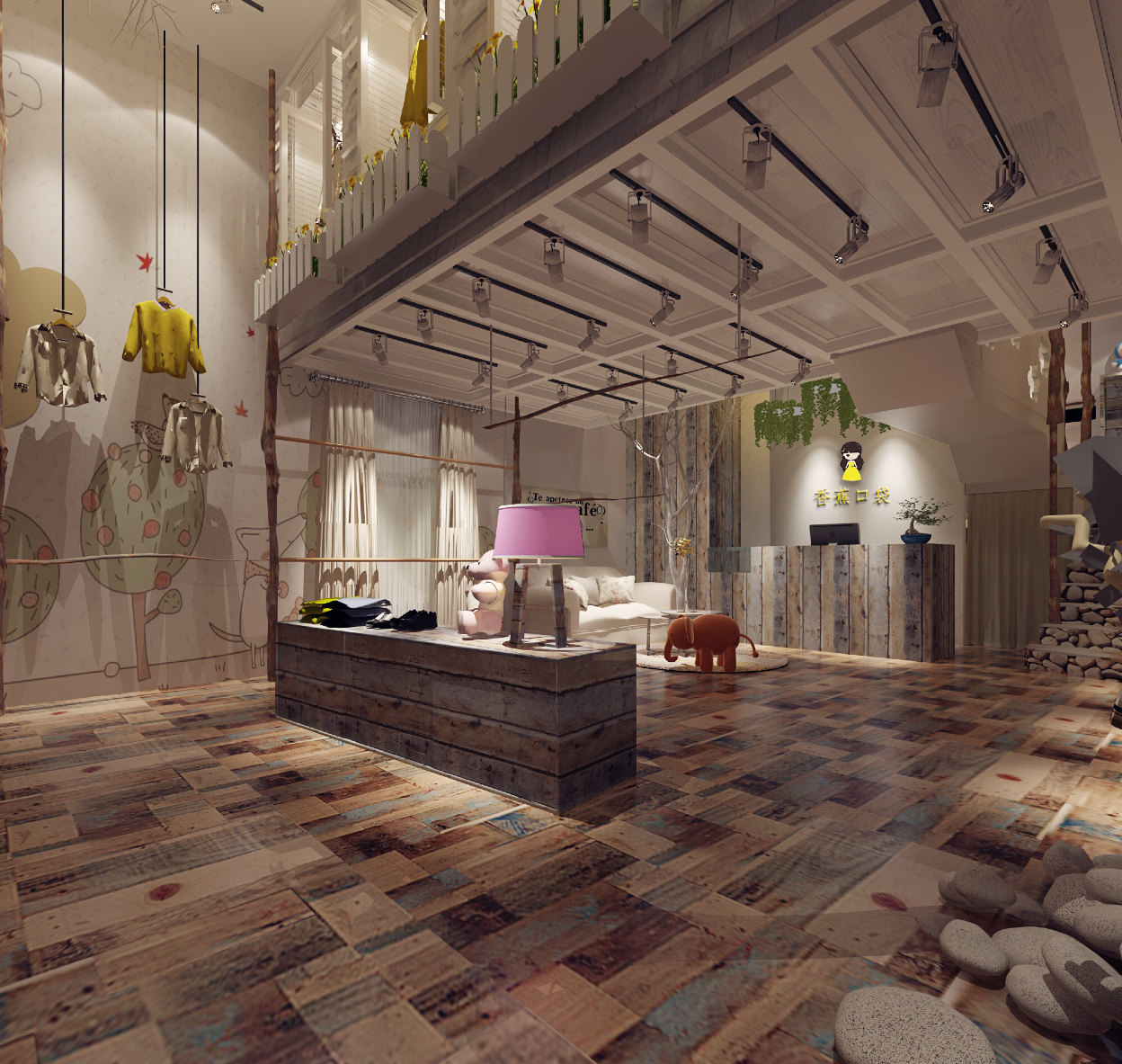 本次装修风格是依据店主的儿童服装店,这种装修风格主要是以浅木调的木质材料,不管是在地板的装修还是衣架上面,使用的材质都是浅色木的木质材料,搭配上小孩子都喜欢的装饰品,整个风格的感觉就出来了,墙面不需要过多的装饰都已经足够吸引人了。这种小清新的装修风格最适合于孩子,他们正处于天真烂漫的时候,很容易被这些吸引。