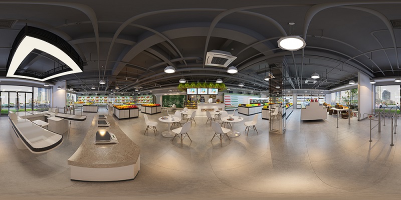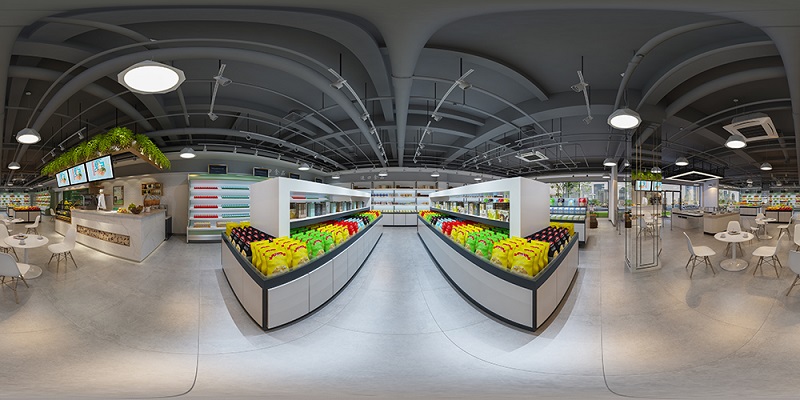 我们再来看一看这个水果专卖超市的整体效果,天花与地面形成的落差,凸显水果的奢华,随意横扫一眼,高端大气的感觉无处不在。