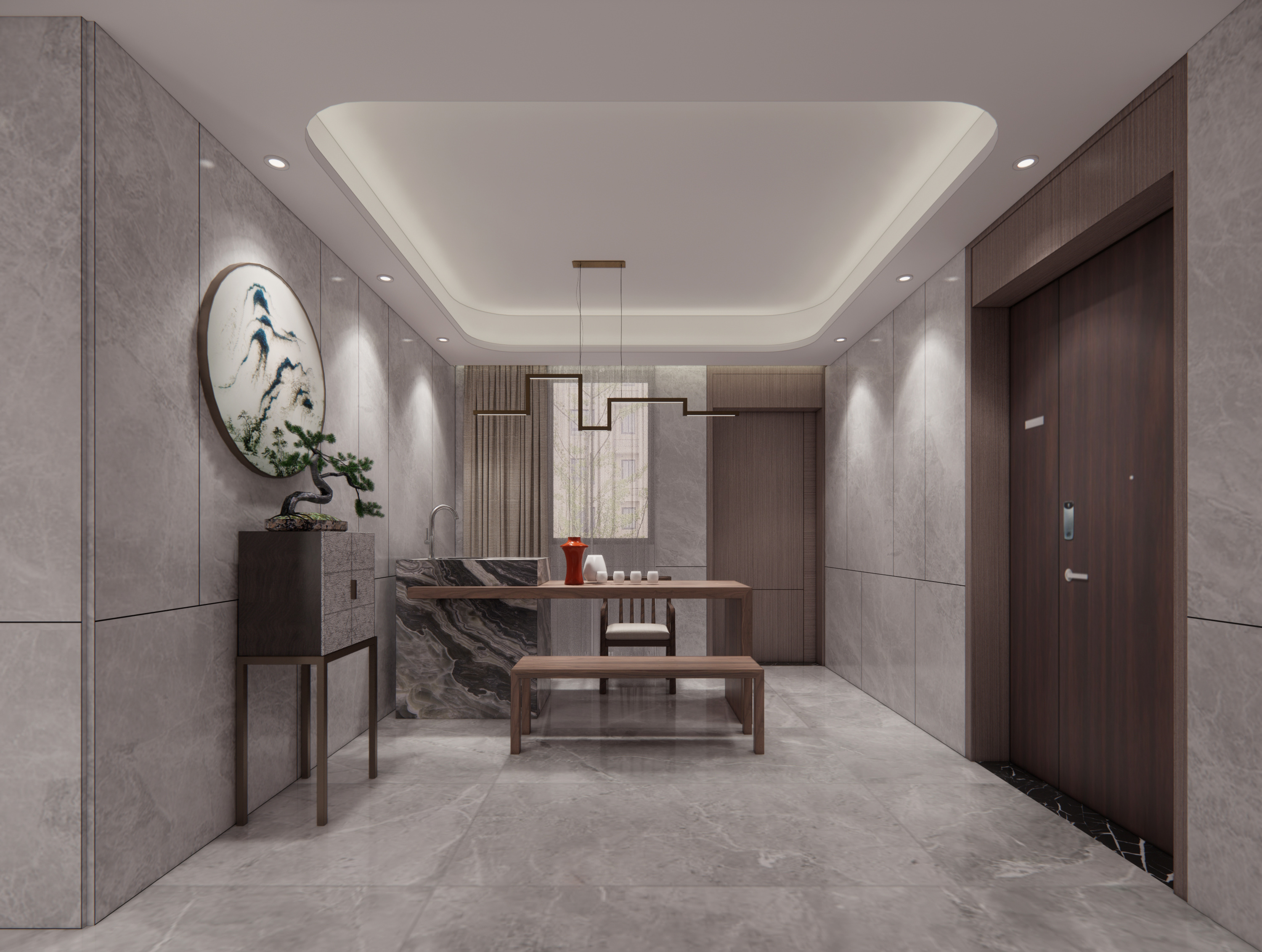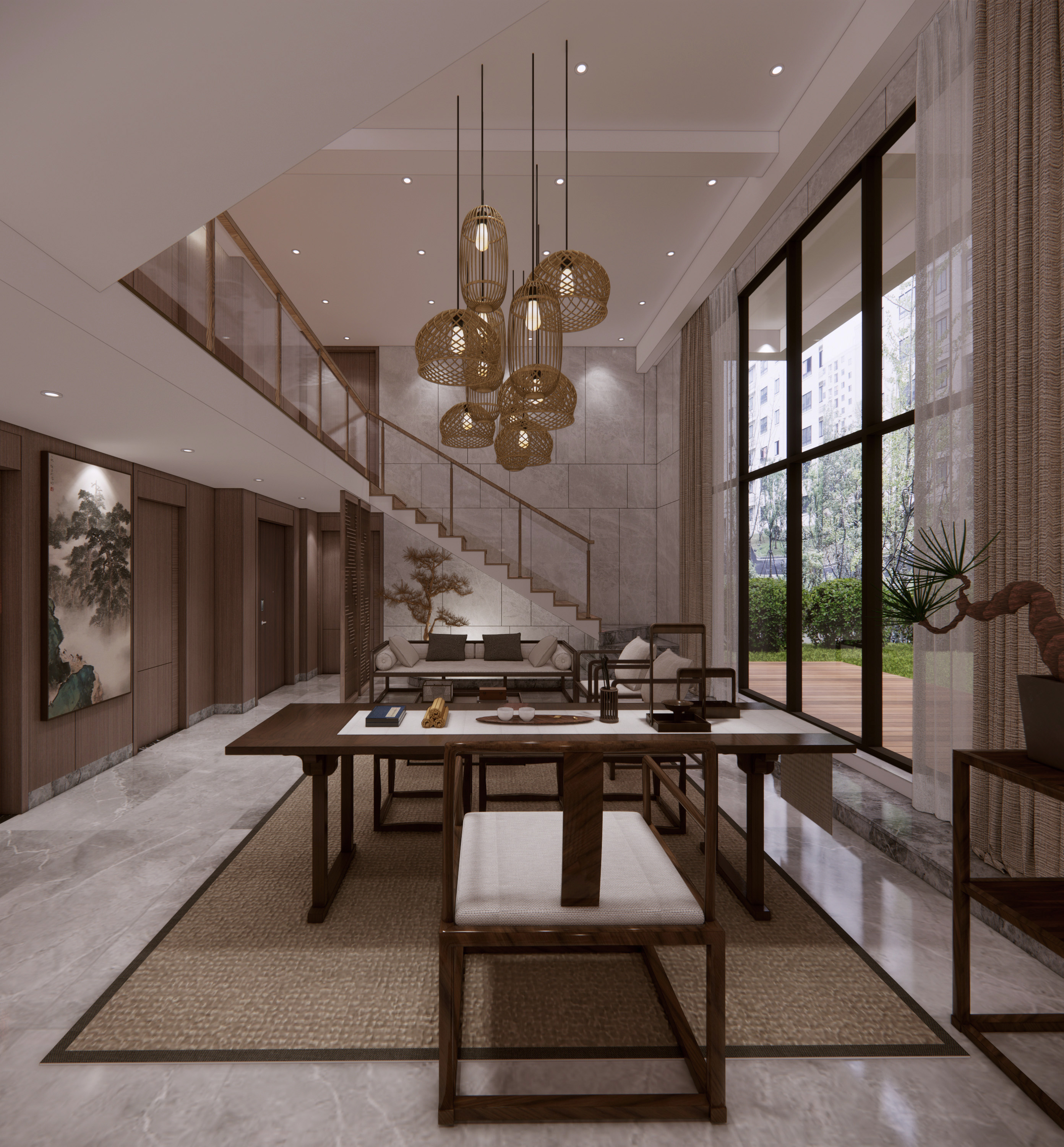 业主的房子位于南昌湾里区,装修风格新中式偏现代, 从现浇到拎包入住,业主都十分满意。整个装修清新奢华。4米6落地大窗户,采光非常好。马可波罗大理石纹理75*150大板砖上墙,奢华高档,挑空层实木贴皮木饰面上墙,木皮纹理清新可见,一楼客厅大板砖上墙,十分漂亮,业主对选材十分满意,色彩搭配相得益彰。配上大红鹰黑檀实木家具,高档奢华的感觉一进大厅就映入眼帘,高端大气上档次。