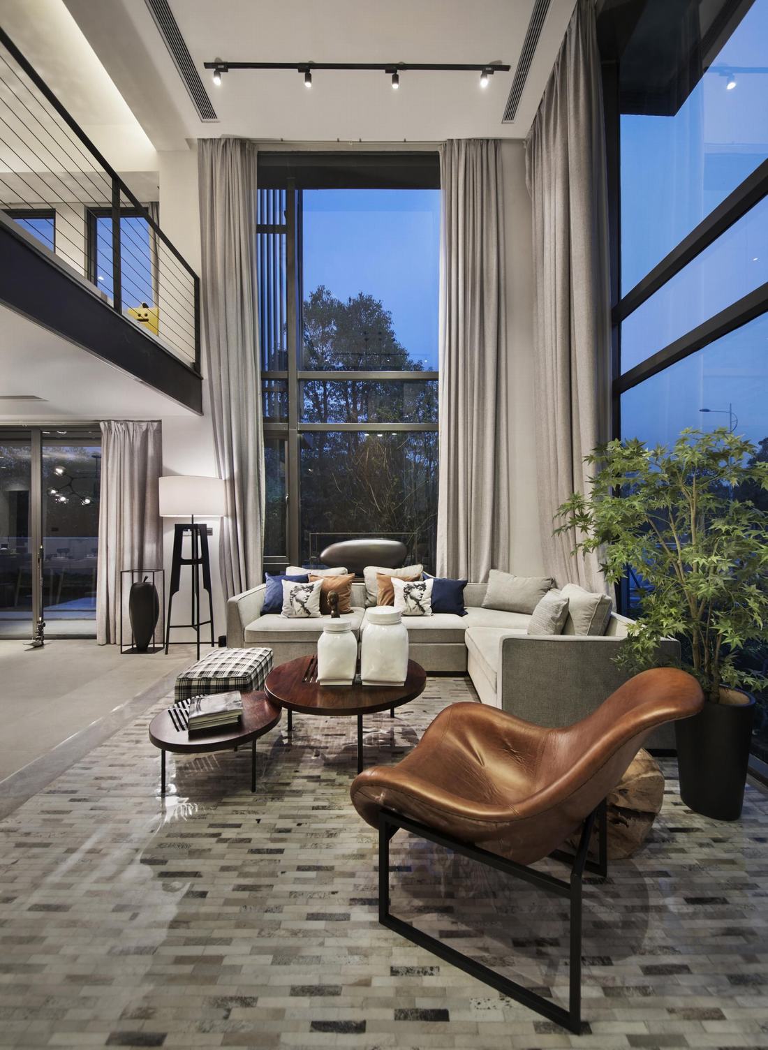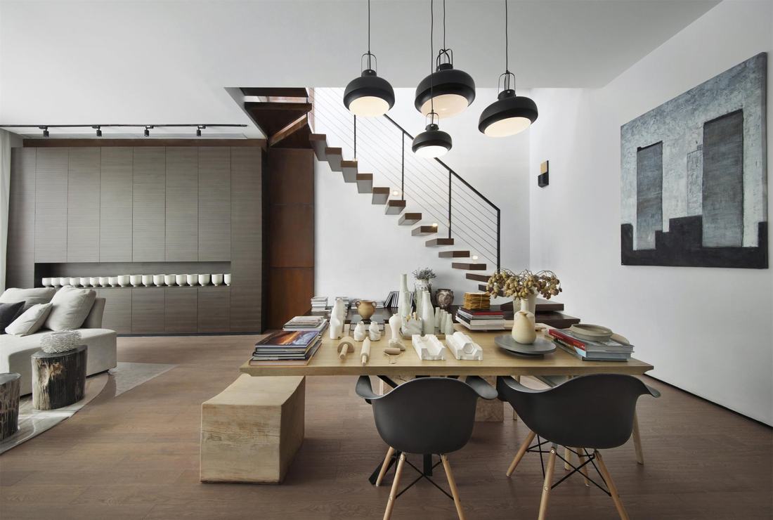 每一寸阳光的移动都为室内的明暗光影带来不同的变化,一层通过5.5米的中空落地窗与建筑窗框、窗纱的碰撞,光影形成多重投射,墙身锈铁板,既体现材料自然的质感,也是各楼层空间的连接点,通过楼梯由地下一层延伸到地上三层,木色钢制楼梯,结合上方的天窗,白天与黑夜在不同光线下具有神奇的透视效果。开放式的厨房、一张加长的原木餐桌,即使全天在室内游走,同样的一个沙发位置,同样的一扇窗前,所看到的景象与感受也迥然不同。这不仅仅是移步换景,更是“移时换景”,是人与空间、自然所能发生的最和谐丰富的关系形态。