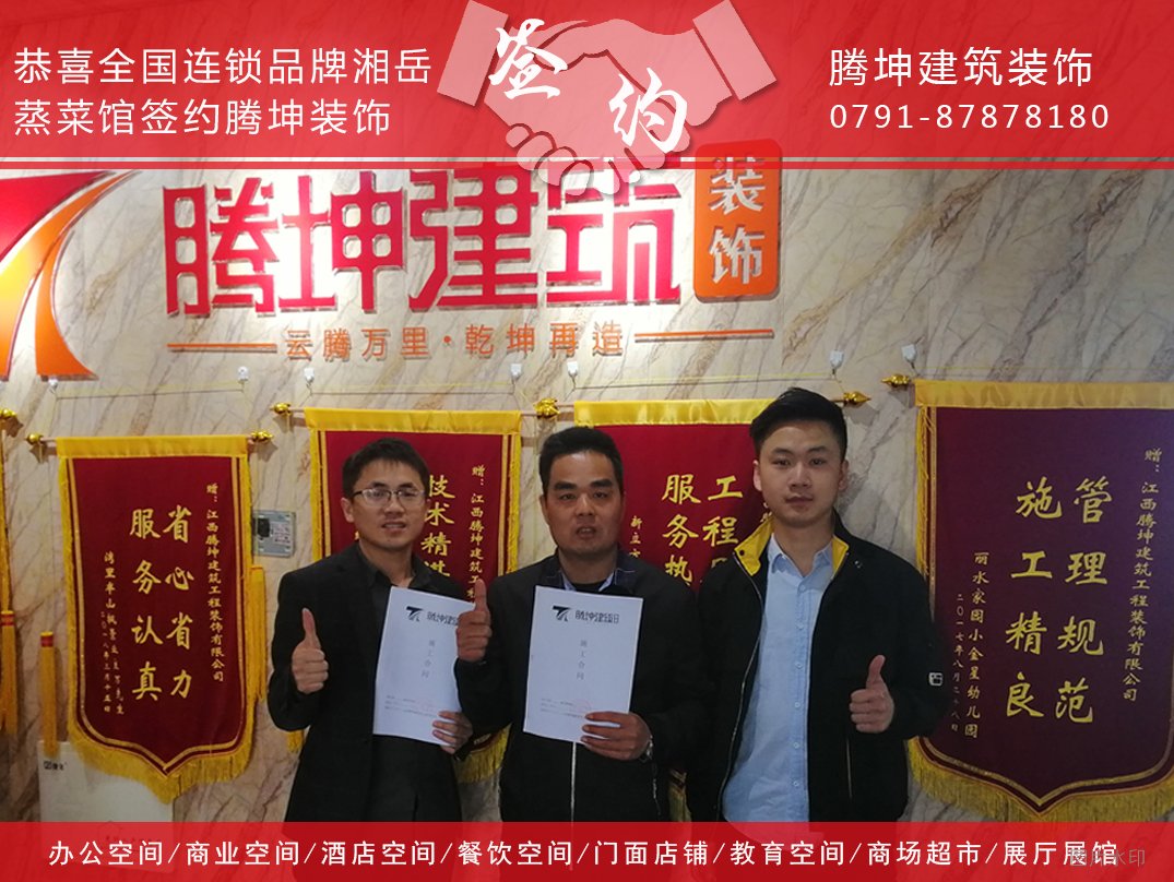 恭喜全国品牌连锁湘岳蒸菜馆签约腾坤装饰,非常感谢王先生对我公司的认可以及支持,在后期装修工程中,腾坤装饰竭诚为您服务!!